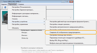 Можно отключить отображение сообщения [Вскоре потребуется замена картриджа с тонером.], выполнив следующие действия. Выберите меню [Параметры] окна состояния принтера  [Настройки устройства]  Снимите флажок [Отображать уведомление о замене картриджей] в диалоговом окне [Настройки отображения предупреждения].