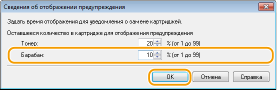 В пункте [Барабан] пункта [Оставшееся количество в картридже для отображения предупреждения] укажите оставшееся количество тонера в картридже с барабаном для отображения сообщения, затем щелкните [OK].