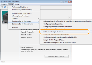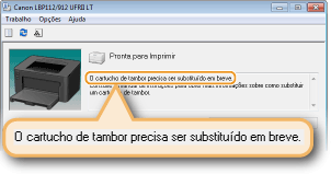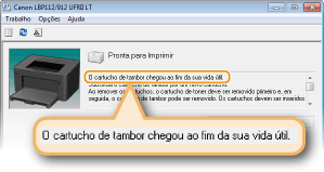 Pode desativar a visualização da mensagem [O cartucho de tambor precisa ser substituído em breve.] com o seguinte procedimento: Selecione o menu [Opções] da Janela de Estado da Impressora  [Configurações do Dispositivo]  Desmarque a caixa de verificação [Exibir Notificação de Substituição do Cartucho] na caixa de diálogo [Configurações de Exibição de Avisos].