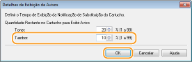 No item [Tambor] em [Quantidade Restante no Cartucho para Exibir Aviso], especifique a quantidade restante no cartucho de tambor para apresentação da mensagem e clique em [OK].