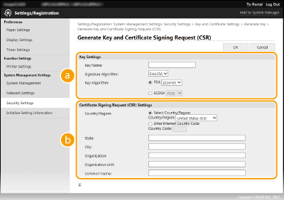 Because certificates generated on the machine do not have a CA signature, a communication error may result depending on devices it communicates with. To have the certificate authority issue the certificate with the CA signature, you need to obtain data of CSR (Certificate Signing Request), which the administrator can generate from Remote UI. When the certificate is issued, register it in the key with the CSR generated.