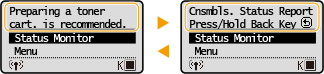 Messages are displayed on the screen in situations such as when paper runs out or when the expiration of the toner cartridge lifetime is reached.