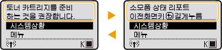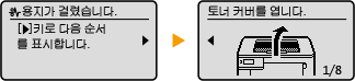 용지가 떨어지거나 토너 카트리지 수명이 다하는 경우, 화면에 메시지가 표시됩니다.