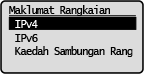Memaparkan tetapan rangkaian seperti alamat IP mesin dan status seperti keadaan komunikasi LAN wayarles.