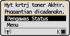 Mesin ini memaparkan mesej apabila jumlah baki di dalam kartrij toner adalah rendah. Perhatikan bahawa kualiti cetakan boleh merosot jika anda meneruskan cetakan tanpa menyelesaikan isu ini. Anda boleh menyemak jumlah baki dalam kartrij toner pada paparan (