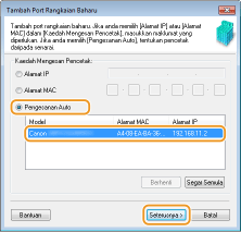 Klik [Segar semula]. Jika masalah berterusan, pilih [Alamat IP] atau [Alamat MAC], masukkan alamat IP atau alamat MAC mesin (Melihat Tetapan Rangkaian) dan kemudian klik [Seterusnya].