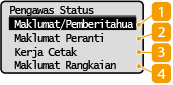 Apabila anda memilih <Pengawas Status>, satu skrin muncul di mana anda boleh menyemak perkembangan dokumen serta status mesin (jumlah baki dalam kartrij toner dsb.) dan tetapan rangkaian seperti alamat IP mesin.