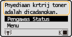 Mesin ini memaparkan mesej apabila jumlah baki di dalam kartrij toner adalah rendah. Perhatikan bahawa kualiti cetakan boleh merosot jika anda meneruskan cetakan tanpa menyelesaikan isu ini. Anda boleh menyemak jumlah baki dalam kartrij toner pada paparan (