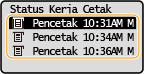 Apabila <Papar Log Kerja> ditetapkan kepada <Tak Aktif>, anda tidak boleh menyemak log cetakan. <Papar Log Kerja>