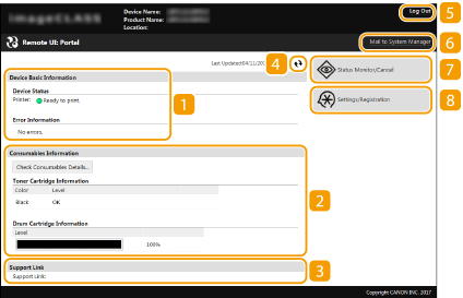 เมื่อคุณเข้าสู่ Remote UI หน้าพอร์ทัลต่อไปนี้จะปรากฏขึ้น ส่วนนี้จะอธิบายรายการที่แสดงในหน้าพอร์ทัลและการทำงานพื้นฐาน