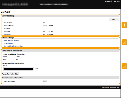 เมื่อคุณเข้าสู่ระบบด้วยสิทธิ์ของผู้ดูแล หน้าพิเศษสำหรับ AirPrint จะปรากฏดังที่แสดงด้านล่างนี้