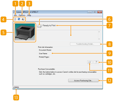 The Printer Status Window is a utility that allows you to check the machine's status, view error information, and make settings related to the machine, such as power saving settings. You can also use it for operations such as cancelling a print job or printing a list of the machine's settings. The Printer Status Window utility is installed on your computer when you install the printer driver.