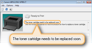 The machine displays a message in the Printer Status Window when the amount remaining in the toner cartridge is low. Note that the print quality may suffer if you continue printing without resolving this issue. You can check the amount remaining in the toner cartridges in the Printer Status Window (