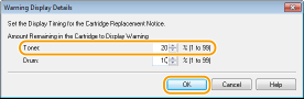 In [Toner] under [Amount Remaining in the Cartridge to Display Warning], specify the amount remaining in the toner cartridge to display the message, then click [OK].