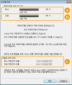 아래 방법으로 토너 카트리지 잔량 등을 확인하십시오. 대량의 인쇄 작업을 시작하기 전에 새 토너 카트리지 또는 새 드럼 카트리지를 준비할 필요가 있는지 확인하는 것이 특히 중요합니다.