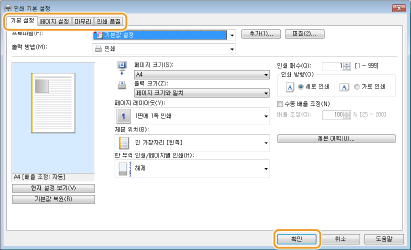 기기의 프린터 드라이버를 선택하고 [기본 설정] 또는 [속성]을 클릭합니다.