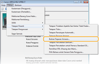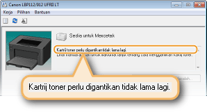 Anda boleh melumpuhkan paparan mesej [Kartrij toner perlu digantikan tidak lama lagi.] dengan melakukan seperti berikut: Pilih menu [Pilihan] Tetingkap Status Pencetak  [Tetapan Peranti]  Kosongkan kotak semak [Papar Notis Penggantian Kartrij] dalam kotak dialog [Tetapan Paparan Amaran].