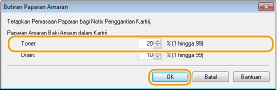 Dalam [Toner] di bawah [Paparan Amaran Baki Amaun dalam Kartrij], tentukan jumlah baki di dalam kartrij toner untuk memaparkan mesej, kemudian klik [OK].