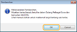 Pembersihan menggunakan kartrij toner dalam kartrij gelendong. Pastikan terdapat kartrij toner dan kartrij gelendong mencukupi yang tinggal terlebih dahulu. Periksa Baki Yang Ada