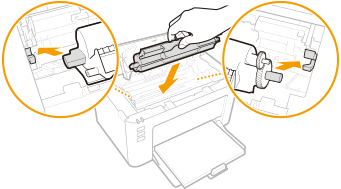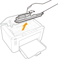 Jangan goncang atau condongkan kartrij toner. Juga pastikan untuk elak mengenakan getaran kepada kartrij toner, seperti memukulnya terhadap sesuatu. Melakukannya boleh menyebabkan toner yang tinggal dalam kartrij toner bocor. Keluarkan kartrij toner dengan perlahan pada sudut yang sama dengan slot.