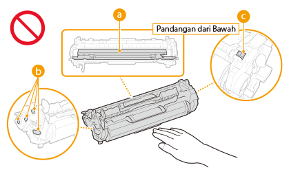 Apabila pelupusan kartrij toner, kartrij gelendong yang telah digunakan atau sebagainyaApabila membuang kartrij toner, kartrij gelendong atau sebagainya, letakkannya dalam bahan pembungkusan asal untuk menghalang toner daripada berselerak dari dalam dan lupuskan kartrij toner itu menurut peraturan tempatan yang berkenaan.