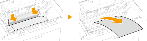 จับที่ขอบกระดาษทั้งสองด้าน ดึงขอบหัวกระดาษลง แล้วดึงกระดาษออกมา