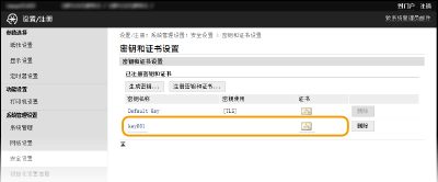 如果密钥和证书当前用于某种用途,例如当在 [密钥使用] 下显示“[TLS]”时,无法删除密钥和证书。在这种情况下,请禁用此功能或更换密钥和证书,然后再进行删除。