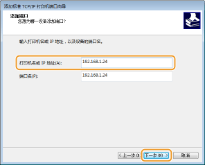 4 | 输入本机的 IP 地址或 DNS 名称,然后单击 [下一步]。 自动输入 [端口名],如果需要,可进行更改。 ![]() ![]() 显示下一个画面时,按照画面上的说明操作。 ![]() *选择 [设备类型] 时,在 [标准] 下选择 [Canon Network Printing Device with P9100]。 |