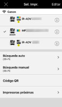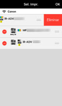 En la pantalla [Sel. Impr.], podrá comprobar la información del dispositivo y el estado del dispositivo, además de seleccionar el dispositivo que quiera utilizar en la lista de dispositivos registrados.