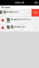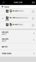 [프린터 선택] 화면에서 장치 정보 및 장치 상태를 확인하고 등록된 장치 목록에서 사용할 장치를 선택할 수 있습니다.