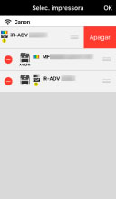 Na tela [Selec. impressora], você pode verificar a informação e o status do dispositivo e selecionar o dispositivo que deseja usar na lista de dispositivos registrados.