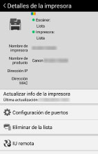 Para volver a esta aplicación después de abrir la IU remota, toque el icono de esta aplicación en la pantalla de inicio de su terminal móvil. Según el tipo de dispositivo, es posible que no pueda visualizar la IU remota desde el terminal móvil. Si esto sucede, compruebe el estado del dispositivo en la IU remota visualizada desde el PC o el panel de control del dispositivo. Si la IU remota se visualiza desde el terminal móvil, es posible que no pueda utilizar ciertas funciones, como las operaciones de archivos. Si esto sucede, lleve a cabo las operaciones desde la IU remota visualizada desde el PC o el panel de control del dispositivo. Si se han configurado los ajustes de proxy utilizando los ajustes de Wi-Fi del terminal móvil, no podrá visualizar la IU remota del dispositivo que registró mediante Wi-Fi Direct. En este caso, compruebe el estado del dispositivo que se visualiza en la IU remota del PC o en el panel de control del dispositivo. |