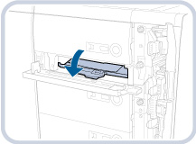 If the tail edge of long sheet jammed in the POD Deck-D1 + POD Buffer Unit-A1 is visible on the escape tray, pull out the paper to clear the jam.