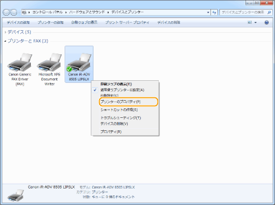 本機のアイコンを右クリックし、[プリンターのプロパティ]または[プロパティ]をクリックする