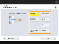 封筒/はがきの用紙種類は<用紙種類>の詳細設定画面から選択することはできません。封筒/はがきの用紙種類を選択する場合は、<よく使う用紙の登録 (手差しトレイ)>に使用する封筒/はがきの用紙種類を登録したあと、手順2で<よく使う用紙>  封筒/はがきの用紙種類を登録したボタン  <OK>を押してください。手差しトレイでよく使う用紙サイズと種類を登録する