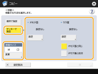 両面コピー時にウラ面の画像も移動させたい場合は、<ウラ面>の設定が必要です。オモテ面と同じ位置に移動する場合は<オモテ面と同じ>を押し、左右対称に移動する場合は<オモテ面と反対>を押します。オモテ面と異なる位置に移動させたい場合は、<設定>を押して移動距離を入力します。