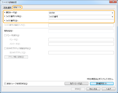 [宛先入力]タブをクリックし、使用する通信モードとファクス番号を指定する