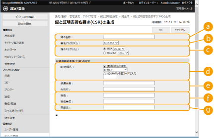 鍵とCSRを本機で生成します。CSRのデータは画面に表示されるほか、ファイルに出力することもできます。