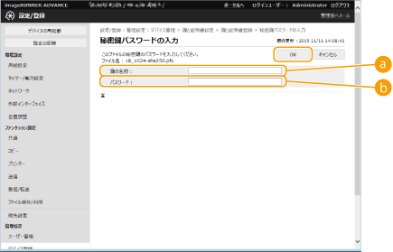 リモートUIから鍵と証明書(サーバー証明書)を登録します。本機に登録可能な鍵と証明書については、システム仕様を参照してください。