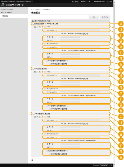 本設定は、インポート/エクスポートできます。複数のデバイス(ビジュアルメッセージ機能に対応したキヤノン製機器のみ)に同じ設定をインポートすることで、同一のお知らせや情報を表示できます。設定データをインポート/エクスポートする