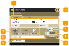 メインメニューの<スキャンして保存>を押したあと、<ボックス>、<アドバンスドボックス>、<ネットワーク>、<メモリーメディア>のいずれかを押して原稿を読み込もうとすると、次の設定画面が表示されます。