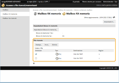 ![]() | È possibile utilizzare la IU remota per stampare, inviare o eliminare i file che sono stati memorizzati nella Mailbox, oppure i fax e I-fax che sono momentaneamente memorizzati nella Mailbox Fax/I-Fax. |