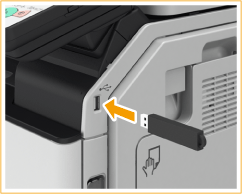 Sie können USB-Speichermedien in USB-Anschlüsse stecken, die sich auf der rechten Seite des Geräts befinden, und dann Daten von diesen USB-Speichermedien direkt drucken. Auch die über das Gerät eingescannten Dokumente können direkt auf USB-Speichermedien gespeichert werden.