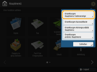 Das Hauptmenü ist der Startbildschirm für die Funktionen. Obwohl das Hauptmenü zum Zeitpunkt des Kaufs für die einfache Bedienung konfiguriert ist, können Sie es an Ihre täglichen Bedienungsabläufe anpassen. Zur Anpassung des Hauptmenüs müssen Sie sich mit Administratorrechten anmelden.