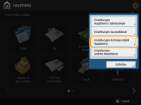 Wenn Sie nur die erste Seite der Einstellungsschaltflächen im Hauptmenü anzeigen möchten, drücken Sie  <Einstellungen anderes Hauptmenü>, und setzen Sie <Nur 1ste Seite verwenden> auf <Ein>. |