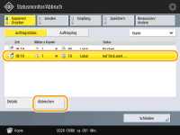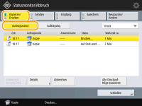 Wenn Sie im Bedienfeld auf (Stopp) drücken, während die Kopieraufträge in der Warteschlange sind, wird der Kopierauftrag angehalten. Danach werden die Nachricht <<Stopp>Kopierauftrag zum Abbrechen wählen.> und die Liste der Kopieraufträge angezeigt. Sie können den Kopierauftrag aus der Liste auswählen und den Auftrag abbrechen, indem Sie auf <Abbrechen> drücken. Wenn Sie das Kopieren fortsetzen möchten, drücken Sie auf <Kop. wd.aufnehm.>. |