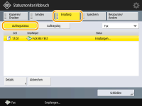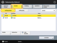 Durch Drücken auf <Details> <Neu senden> können Sie Dokumente, die nicht gesendet werden konnten, erneut senden. Um ein anderes Ziel anzugeben, drücken Sie <Empfänger ändern>. Drücken Sie bei Dokumenten mit mehreren Zielen, die anhand derselben Sendemethode angegeben wurden, auf <Rundsendeliste>, wählen Sie ein Ziel, und drücken Sie dann <Neu senden> oder <Empfänger ändern>.Sie können Dokumente erneut senden, wenn <Fehlgeschlagene SE-Aufträge löschen> auf <Aus> gesetzt ist (<Fehlgeschlagene SE-Aufträge löschen>). Beachten Sie, dass Sie die mit direktem Senden/manuellem Senden/PC-Fax gesendete Dokumente nicht erneut senden können. Sie können die Ziele von Dokumenten ändern, die zum Senden an einer eingestellten Zeit festgelegt sind, sowie von Dokumenten, die nicht gesendet werden konnten. Beachten Sie, dass Sie die Ziele von Dokumenten mit mehreren Zielen zum Senden nicht ändern können. Außerdem können Sie keine Ziele ändern, wenn die Eingabe eines neuen Ziels eingeschränkt ist (Einschränken der verfügbaren Empfänger). Das Ziel kann sowohl für einen Auftrag geändert werden, der aufgrund von Übertragungsfehlern abgebrochen wird, als auch für einen Auftrag, der sich im Modus für verzögertes Senden in der Warteschleife befindet. Es ist nicht möglich, mehrere Ziele gleichzeitig zu ändern. Ebenso können Sie die Ziele innerhalb einer Gruppe nicht gleichzeitig ändern. |