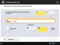 Sie können nicht direkt versenden, wenn <Einstellungen für Aktualisierung gesendeter Dokum.> auf <Ein> gesetzt ist. Diese Einstellung wechselt in den folgenden Fällen zu <Aus>. Geben Sie dann je nach Bedarf das Ziel erneut an oder setzen Sie die Einstellung wieder auf <Ein>. Wenn das Backup-Ziel aus dem Adressbuch gelöscht wurde Wenn ein Adressbuch aus dem Remote UI importiert wurde Importieren/Exportieren von Einstellungsdaten Wenn ein Adressbuch über <Einstellungen Verteil. Geräte-Informationen> Verteilen der Geräteinformationen an andere Canon-Multifunktionsdrucker empfangen wurde |