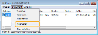 Wählen Sie das abzubrechende Dokument aus, und klicken Sie auf [Dokument]  [Abbrechen].