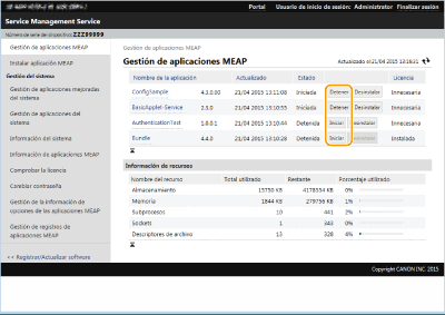 2 | Haga clic en [Iniciar] / [Detener] para poder utilizar la aplicación MEAP. ![]() ![]() En función de la aplicación MEAP, tendrá que reiniciar el equipo. Siga las instrucciones en pantalla y reinicie el equipo. Cuando se acaban los recursos necesarios para la memoria, hilos, enchufes o descriptores de archivo, la aplicación no se iniciará, aunque haga clic en [Iniciar]. |